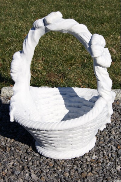 Wykonana z białego betonu fantazyjna donica w kształcie plecionego, wiklinowego koszyka.