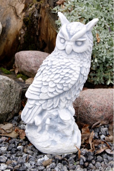 Wykonana z białego betonu figura sowy siedzącej na skale.