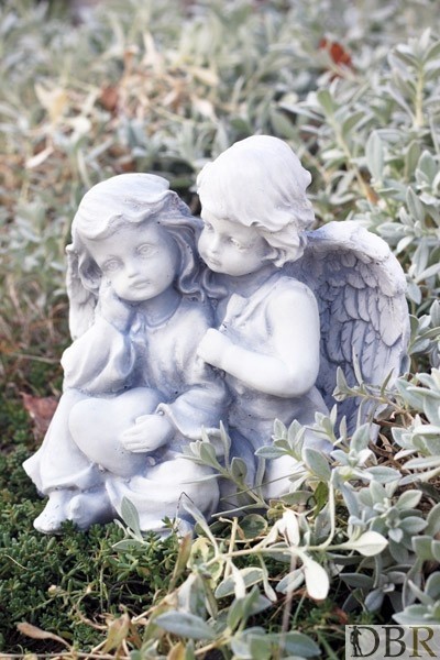 Mała figurka dwóch przytulających się amorków wykonana z białego betonu.