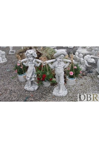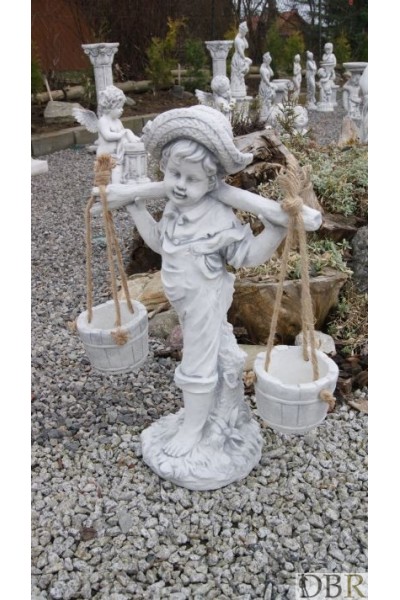 Piękna figurka przdstawiająca chłopca który na swych ramionach dzwiga wiadra.Wiaderka można wykorzystać jako kwietniki na kwiaty.Całość wykonana z białego betonu,utrzymana w antycznym stylu.