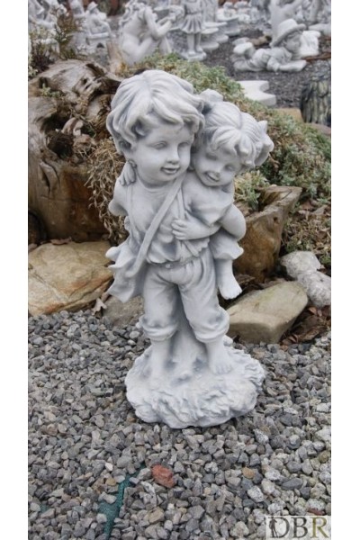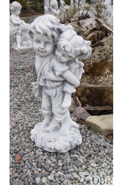 Piękna figurka przedstawiająca chłopca który czyma dziewczynkę na swoich ramionach (na barana) .Całośc wykonana z białego betonu i utrzymana w antycznym stylu.