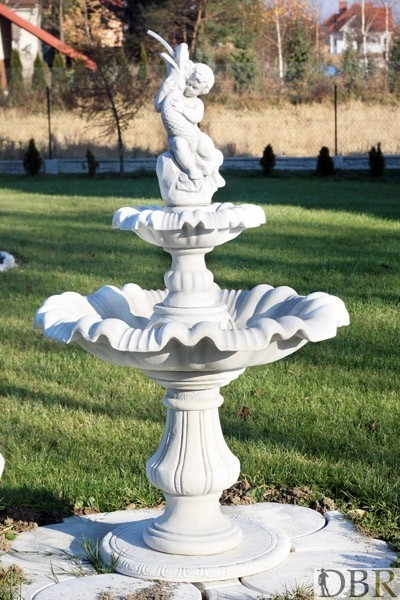 Dwupoziomowa fontanna wykonana z białego betonu. Jej główną część stanowi chłopiec trzymający rybę, z której paszczy tryska strumień wody spływając na niższe poziomy.