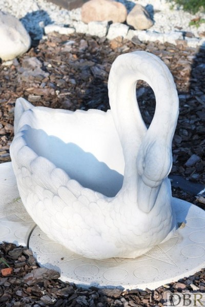 Duży łabądź wykonany z białego betonu. Wśród jego skrzydeł można bezpośrednio zasadzić kwiaty.