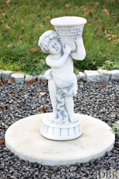 Wykonana z białego betonu utrzymana w antycznym stylu figurka chłopca trzymającego na ramieniu małą wazę.