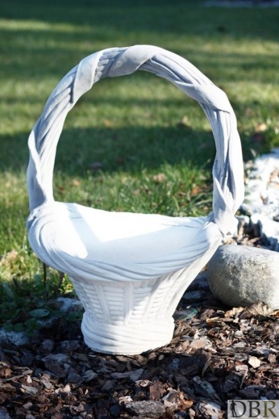 Wykonana z białego betonu fantazyjna donica w kształcie plecionego, wiklinowego koszyka.