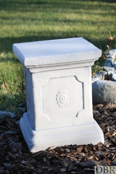 Wykonana z białego betonu klasyczna kolumna o kwadratowej podstawie zdobiona kwiatowym ornamentem.
