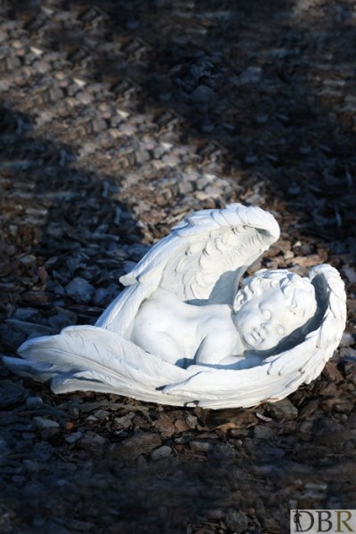 Prześliczny mały śpiący aniołek otulony skrzydełkami.