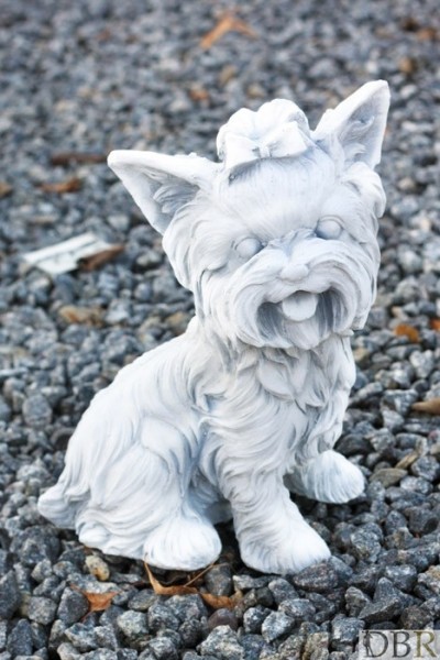 Figurka małego, wesołego pieska rasy york wykonana z białego betonu.