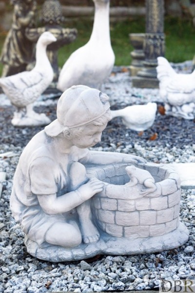 Figurka chłopca siedzącego przy studni, na krawędzi której siedzi żabka. Studnia jednocześnie służy jako donica na kwiaty.