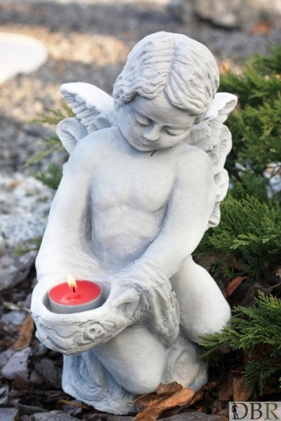 Figurka aniołka trzymającego w rączkach miseczkę przeznaczoną do umieszczenia w niej małej świeczki.
