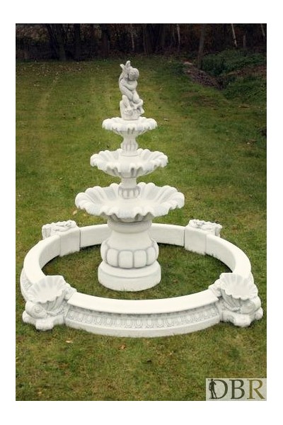 Wykonana z białego betonu 3-poziomowa fontanna z basenem z chłopem trzymająym rybę, z której paszczy tryska strumień wody.