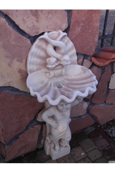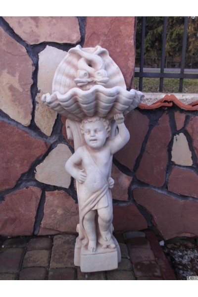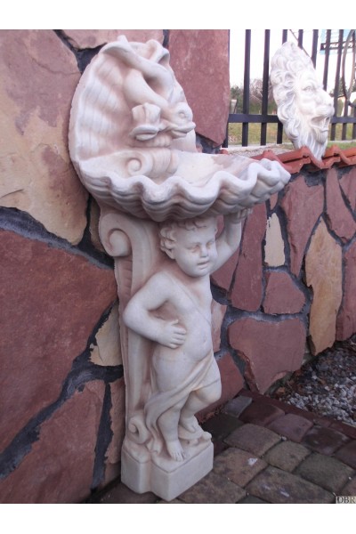 Aniołek podtrzymujący umywalkę w kształcie muszli.Całość wykonana z białego betonu.