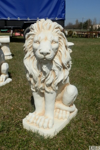 Betonowy lew, siedzący z prawej strony w bliźniaczym duecie strażników domu lub ogrodu.